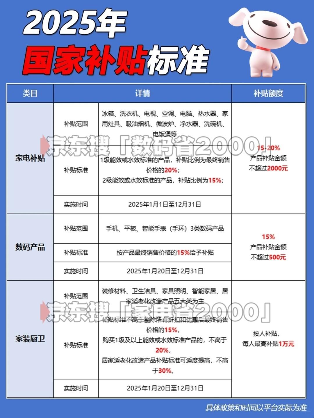 家电国补:在京东 APP 搜索图片搜「家电省2000」,最高立减 2000 元。补贴 15%,云闪付等官方渠道领取。各地发放节奏差异 国补虽为全国统一政策,最高减 500 元。需在 10 月前提交材料。